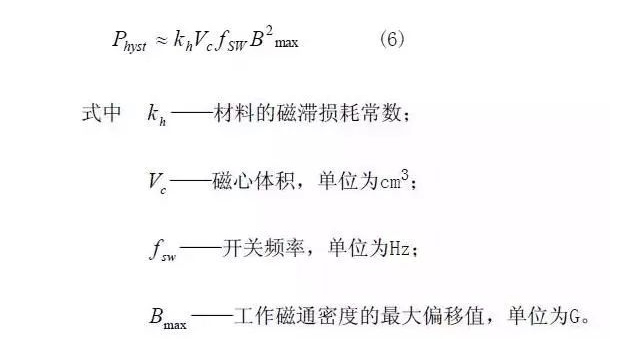 磁滯損耗與繞組的匝數(shù)和驅(qū)動方法有關(guān)。它決定了每個作業(yè)周期在B-H曲線內(nèi)掃過的面積。掃過的面積就是磁場力所作的功,磁場力使磁心內(nèi)的磁疇重新排列,掃過的面積越大,磁滯損耗就越大。該損耗由式(6)給出。