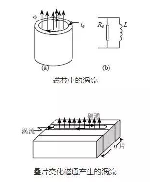 當變壓器工作時。磁芯中有磁力線穿過,在與磁力線垂直的平面上就會發(fā)生感應(yīng)電流,因為電流自成閉合回路形成環(huán)流,且成旋渦狀,故稱為渦流。渦流的存在使磁芯發(fā)熱,消耗能量,這種損耗稱為渦流損耗。