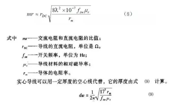 電阻損耗是變壓器或電感內(nèi)部繞組的電阻發(fā)生的損耗。有兩種方式的電阻損耗:直流電阻損耗和集膚效應(yīng)電阻損耗。直流電阻損耗由繞組導(dǎo)線的電阻與流過的電流有效值二次方的乘積所決定。集膚效應(yīng)是由于在導(dǎo)線內(nèi)強交流電磁場效果下,導(dǎo)線中心的電流被“推向”導(dǎo)線外表而使導(dǎo)線的電阻實際添加所致,電流在更小的截面中活動使導(dǎo)線的有效直徑顯得小了。式(8)給出了這兩個損耗在一個表達式中的計算式。