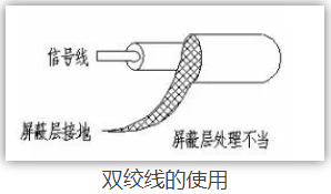 雙絞線、同軸電纜都能有效的抑制電磁干擾。在脈沖信號(hào)傳輸線路中常使用雙絞線,控制輔助電源線和傳感器信號(hào)線最好用雙絞屏蔽線。因?yàn)殡p絞線兩根線之間有很 小的回路面積,而且雙絞線的每?jī)蓚€(gè)相鄰的回路上感應(yīng)出的電流具有大小相等、方向相反,產(chǎn)生的磁場(chǎng)相互抵消,這樣就可以減小因輻射引起的差模干擾,不過(guò)雙絞 線絞合的圈數(shù)最好為偶數(shù),且每單位波長(zhǎng)所絞合的圈數(shù)愈多,消除耦合的效果愈好。使用時(shí)注意雙絞線和同軸電纜兩端不能同時(shí)接地,只能單端接地,而對(duì)屏蔽線, 屏蔽層兩端接地能既能屏蔽電場(chǎng)還能屏蔽磁場(chǎng),單端接地只能屏蔽電場(chǎng)。使用同軸電纜時(shí)還要注意,其屏蔽層必須完全包覆信號(hào)線接地,即接頭與電纜屏蔽層必須 3600搭接,才能有效屏蔽電磁場(chǎng),如圖所示,信號(hào)線裸露部分仍可以與外界形成互容耦合,降低屏蔽效能。