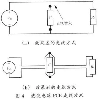 圖4顯示了在一個PCB上輸入電源(Vin)至負(fù)載(RL)的不同走線方式。為了降低濾波電容器(C)的ESL,其引線長度應(yīng)盡量減短;而Vin。正極至RL和Vin負(fù)極至R1的走線應(yīng)盡量靠近。