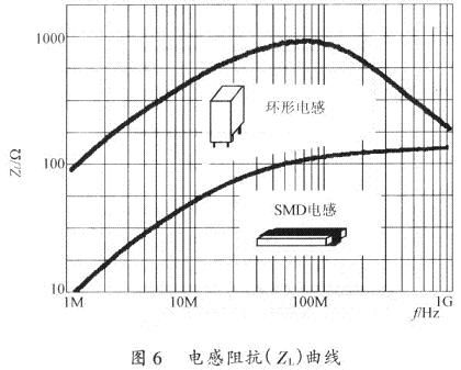 電感通常存在等效并聯(lián)電阻(EPR)和等效并聯(lián)電容(Cp)二個寄生參數(shù)。圖6是電感在不同工作頻率下的阻抗(ZL)。