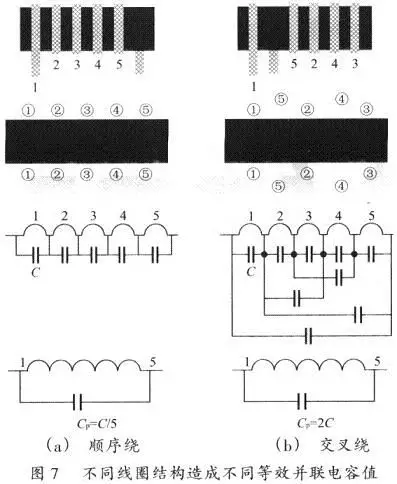 在開關(guān)電源中電感的Cp應(yīng)該控制得越小越好。同時必須注意到,同一電感量的電感會由于線圈結(jié)構(gòu)不同而產(chǎn)生不同的Cp值。圖7就顯示了同一電感量的電感在二種不同的線圈結(jié)構(gòu)下不同的Cp值。圖7(a)電感的5匝繞組是按順序繞制。這種線圈結(jié)構(gòu)的Cp值是l匝線圈等效并聯(lián)電容值(C)的1/5。圖7(b)電感的5匝繞組是按交叉順序繞制。其中繞組4和5放置在繞組1、2、3之間,而繞組l和5非??拷?。這種線圈結(jié)構(gòu)所產(chǎn)牛的Cp是1匝線圈C值的兩倍。
