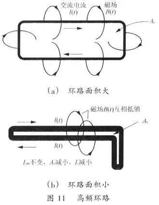 1.4高頻環(huán)路開關(guān)電源中有許多由功率器件所組成的高頻環(huán)路,如果對這△環(huán)路處嬋得不好的話,就會對電源的正常工作造成很大影響。為了減小高頻環(huán)路所產(chǎn)生的電磁波噪音,該環(huán)路的面積應(yīng)該控制得非常小。如圖l1(a)所示,高頻電流環(huán)路面積很大,就會在環(huán)路的內(nèi)部和外部產(chǎn)生很強(qiáng)的電磁于擾。同樣的高頻電流,當(dāng)環(huán)路面積設(shè)計得非常小時,如圖11(b)所示,環(huán)路內(nèi)部和外部電磁場互相抵消,整個電路會變得非常安靜。