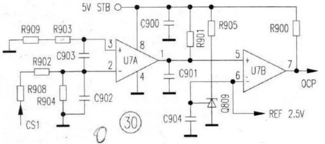 3、維護(hù)回路:U1芯片自身和3腳外圍電路構(gòu)成過流維護(hù)回路;N1繞組上并聯(lián)的D1、R1、C9元件構(gòu)成了開關(guān)管的反向電壓吸收維護(hù)電路,以供給Q1截止時的反向電流通路,保證Q1的作業(yè)安全;實質(zhì)上穩(wěn)壓回路的電壓反應(yīng)信號,也可看作是一路電壓維護(hù)信號——當(dāng)反應(yīng)電壓起伏達(dá)一定值時,電路實施停振維護(hù)動作;24V的輸出端并聯(lián)有由R18、ZD2、單向晶閘管SCR組成的過壓維護(hù)電路,當(dāng)穩(wěn)壓電路反常,引起輸出電壓反常上升時,穩(wěn)壓二極管ZD2的擊穿為SCR供給觸發(fā)電流,SCR的導(dǎo)通形成一個“短路電流”信號,強(qiáng)制U1內(nèi)部維護(hù)電路產(chǎn)生過流維護(hù)動作,電路處于停振狀況。