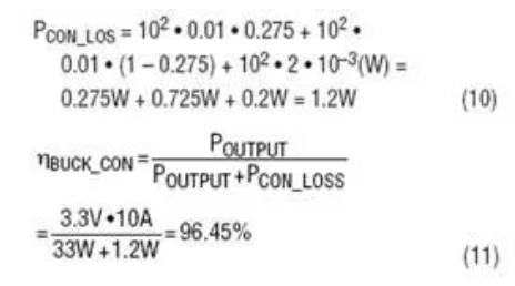 例如,12V輸入、3.3V/10AMAX輸出降壓電源可使用以下元件:MOSFETRDS(ON)=10mΩ,電感RDCR=2mΩ,二極管正向電壓VD=0.5V。因此,滿負載下的傳導(dǎo)損耗為: