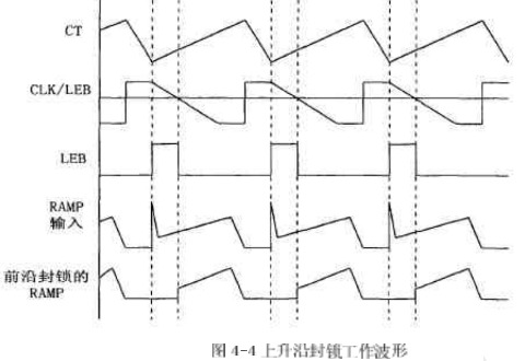 上升沿封鎖工作波形如圖4-4所示,UC3823A、B和UC3825A、B采用固定頻率脈寬調(diào)制。UC3823A、B的兩個輸出端可同時輸出脈沖,輸出脈沖的頻率與振蕩器頻率相等,脈沖占空比可在0%~100%內(nèi)調(diào)整。UC3825A、B的兩個輸出端交替輸出脈沖,因此,每個輸出端輸出脈沖的頻率是振蕩器頻率的1/2,振蕩器的頻率為200KHZ,所以輸出PWM-脈沖的頻率為100KHz,輸出脈沖占空比在0%~一50%以內(nèi)調(diào)整,實際橋式變換器的應(yīng)用中一般達不到50%,因為橋式變換器在PWM脈沖的占空比為50%時,由于功率管截止時間的問題,使得橋臂容易短路,這在以后的部分將詳細介紹。