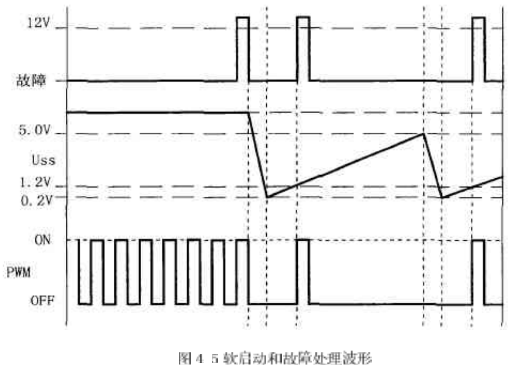 軟啟動和故障處理波形如圖4-5所示。軟啟動是通過軟啟動(SOFT,START)腳的外接電容實現(xiàn)的。接通電源后,軟啟動腳外接電容放電,該腳處于低電平,誤差放大器輸出低電平,開關(guān)電源無輸出電壓。當(dāng)9uA的內(nèi)部電流源給軟啟動腳外接電容充電時,誤差放人器輸出電壓逐漸升高,直到閉環(huán)調(diào)節(jié)功能開始T.作,開關(guān)電源輸出電壓逐漸升高到額定值。一旦限流(ILIM)腳的電平超過1.2V,故障鎖存器置位,輸出腳變?yōu)榈碗娖?/span>;同時,軟啟動腳外接電容以250uA的電流放電。在軟啟動電容放完電后,限流腳電平降到1.2V以下時,故障鎖存器就不輸出脈沖。這時,故障鎖存器復(fù)位,芯片開始軟啟動過程。
