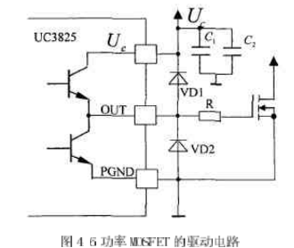 功率MOSFET驅(qū)動電路如圖4-6所示。UC3825推拉式輸出電路的每個輸出端都可輸出峰值為2A的電流。該輸出電流在20ns內(nèi)可使1000pF電容兩端的電壓上升15V。采用獨立的集電極電源Uc和功率地線PGND腳,能夠減小大功率門極驅(qū)動噪聲對集成電路內(nèi)模擬電路的干擾。每個輸出端(OUT)到Uc和PGND之間,都應(yīng)加入一只3A的肖特基二極管(IN5120,USID245或相同性能的器件),如圖4-6所示。該二極管可將輸出電壓的幅值鉗位在電源電壓,這對任何電感性和電容性負載都是必要的。