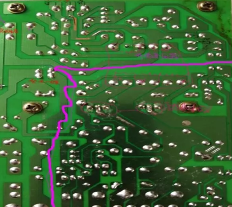 220V交流輸入,通過保險,負溫度熱敏電阻,安規(guī)電容,共模電感組成的抗電磁干擾電路及過流保護電路,經(jīng)過整流二極管整流濾波后輸出300V左右的直流電壓。這是電源板正面圖,用紅線畫出的部分為熱地與冷地部分(開關(guān)電源接地方式有熱地和冷地之分,與220V電源直接相連的地稱為熱地,人體直接接觸會觸電;經(jīng)開關(guān)變壓器隔離后,再整流濾波后的地稱為冷地,人體直接接觸不會觸電)。這是電路板背面圖,在圖中標出開關(guān)電源的輸入部分、300V濾波大電容、開關(guān)管、開關(guān)變壓器、肖特基二極管等主要元器件。