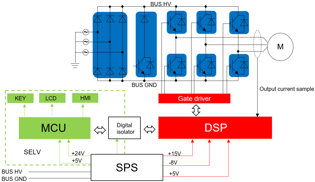 如圖4所示三相變頻器中,左下角綠色虛線圍起來的部分就是SELV電路,輔助開關電源SPS左側的供給MCU的+24V,+5V兩路開關電源與SPS的其余的電壓輸入輸出電氣連接點之間,都必須滿足加強絕緣要求。