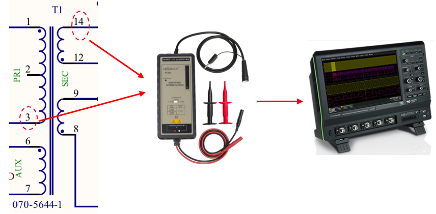 回到本文的重點,接下來測試一次側高壓端與SELV電路之間的重復峰值電壓是否超過750V閾值電壓。有經驗的同學都知道,在開關電源中,重點是要找到變換器中的“動點”,也就是電壓的變化率dv/dt最大的節(jié)點,在圖5中,一次側高壓端的監(jiān)測點就可以選為Q1的Drain極,也就是變壓器T1的pin 3,安全二次側SELV的監(jiān)測點既可以選擇變壓器T1的pin 12,也可以選擇變壓器T1的pin 14,最后以正常帶載工況下一次側、二次側之間檢測到最大電壓為作為設定局部放電電壓UPD的基準。