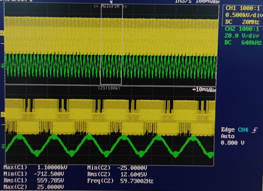 以三相480V變頻器為例,交流輸入線電壓為480Vrms,則其母線電壓平均值為480*1.35=648Vdc,也就是進入輔助開關電源SPS的工作電壓就是648V,這個電壓值已經非常接近750V這個閾值,同時,需要注意的是,750V閾值電壓是在整機實際運行過程中,實際測試得到的一次側高壓端與SELV電路之間的重復峰值電壓,用高壓差分探頭分別勾取兩邊的監(jiān)測點,若此電壓超過750V,同時,在絕緣層厚度方向上的電壓應力超過了1KV/mm,則局部放電測試認證必做。