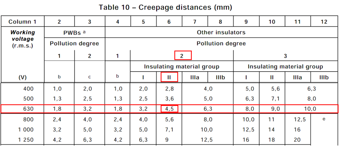 3、增加氣隙長度和爬電距離,以降低電場強度。以圖7中測得的UPD電壓有效值559Vrms去查詢對應的加強絕緣爬電距離要求,如圖14所示,在污染等級為Ⅱ類,采用600>CTI≥400的絕緣材料的條件下,基本絕緣的爬電距離要求為4.5mm,則滿足加強絕緣要求的爬電距離至少為基本絕緣爬電距離要求的2倍,也就是要大于9mm。
