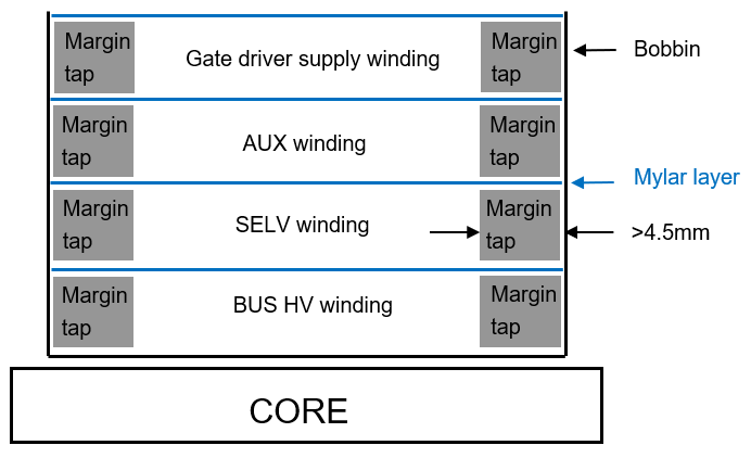 另外,SELV繞組的出線,除了需要用鐵氟龍?zhí)坠艽┕芡?,建議最好不要與一次側高壓繞組的出線端交叉。