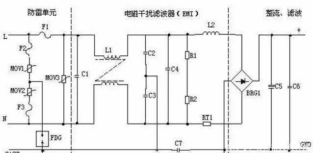 開關(guān)電源的首要電路是由輸入電磁攪擾濾波器(EMI)、整流濾波電路、功率變換電路、PWM操控器電路、輸出整流濾波電路組成。輔助電路有輸入過欠壓維護電路、輸出過欠壓維護電路、輸出過流維護電路、輸出短路維護電路等組成的。
