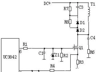 R4、C3、R5、R6、C4、D1、D2組成緩沖器,和開關(guān)電源MOS管并接,使開關(guān)電源管電壓應(yīng)力削減,EMI削減,不發(fā)生二次擊穿。在開關(guān)電源管Q1關(guān)斷時,變壓器的原邊線圈易發(fā)生尖峰電壓和尖峰電流,這些元件組合一起,能很好地吸收尖峰電壓和電流。從R3測得的電流峰值信號參與當(dāng)前作業(yè)周波的占空比操控,因此是當(dāng)前作業(yè)周波的電流束縛。當(dāng)R5上的電壓抵達1V時,UC3842停止作業(yè),開關(guān)電源管Q1當(dāng)即關(guān)斷。R1和Q1中的結(jié)電容CGS、CGD一起組成RC網(wǎng)絡(luò),電容的充放電直接影響著開關(guān)電源管的開關(guān)電源速度。R1過小,易引起振動,電磁攪擾也會很大;R1過大,會下降開關(guān)電源管的開關(guān)電源速度。Z1一般將MOS管的GS電壓束縛在18V以下,然后維護了MOS管。