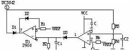 當(dāng)輸出電路短路,輸出電壓消失,光耦OT1不導(dǎo)通,UC3842①腳電壓上升至5V左右,R1與R2的分壓超越TL431基準,使之導(dǎo)通,UC3842⑦腳VCC電位被拉低,IC停止作業(yè)。UC3842停止作業(yè)后①腳電位消失,TL431不導(dǎo)通UC3842⑦腳電位上升,UC3842重新啟動,循環(huán)往復(fù)。當(dāng)短路現(xiàn)象消失后,電路能夠主動康復(fù)成正常作業(yè)狀況。