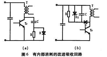 圖6(b)是將變壓器T的原副邊積存的能量轉(zhuǎn).移到電容C上,然后用電阻R將這局部能量耗費(fèi)掉,也可把電阻R換成穩(wěn)壓二極管D,以防止能量的耗費(fèi)。